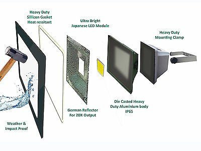 Made in Japan - Heavy Duty IP65 - Toughend Glass - German Reflector - Ultra Bright Japanese LED Module - Heavy Clamp
